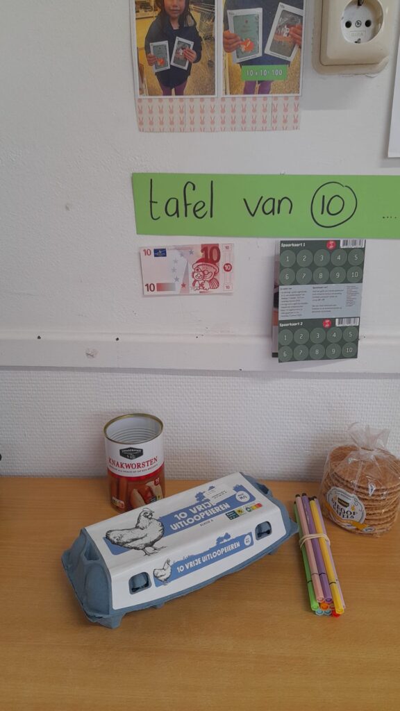 Vanaf vandaag zijn we gestart met het oefenen van de tafel van 10. We hebben eerst besproken wat is een keersom? Het is herhaald optellen bijvoorbeeld, 10+10+10 of 5+5+5+5. De kinderen hebben als opdracht gekregen om thuis of in de winkel te kijken waar je de tafel van 10 ziet. Maak er een foto van en neem het mee naar school. We hebben al 10 stroopwafels in een pak, een eierendoos met 10 eieren, een blikje knakworsten, een stempelkaart en een geld biljet van 10 euro.