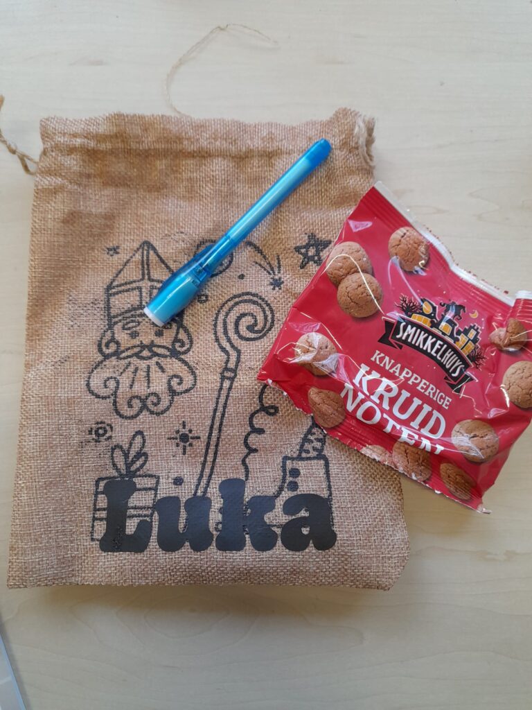Woensdagochtend konden de kinderen niet wachten om naar school te gaan. Ze mochten dinsdag namelijk hun schoen zetten. In de klas waren jutezakjes met naam verstopt. Nadat iedereen z’n eigen zakje gevonden had gingen we kijken wat erin zat. Een magische pen en een zakje pepernoten. Dank u wel Sinterklaas!