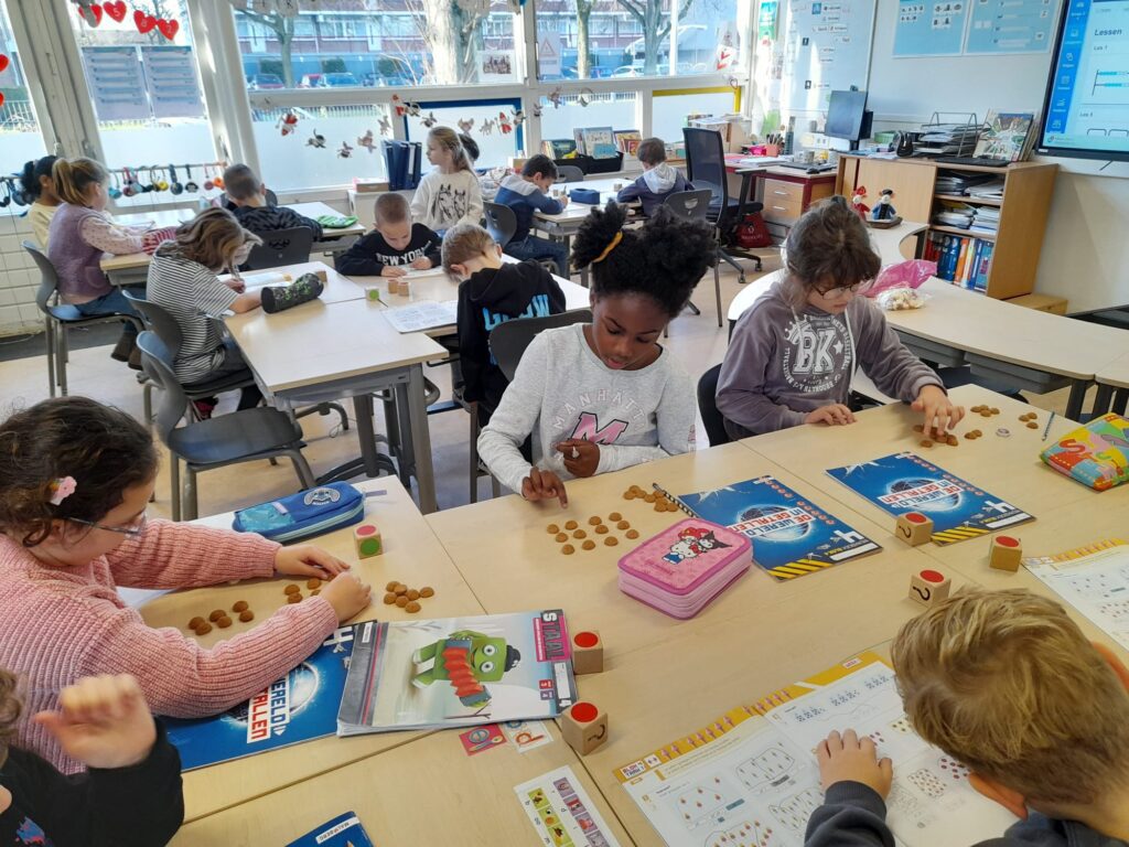 Groep 3 ging splitsen met pepernoten. We begonnen met 10 pepernoten, die kun je splitsen in 5-5, 6-4 etc. Een pepernoot opeten en dan 9 pepernoten splitsen. Ineens konden alle kinderen heel goed splitsen😜.