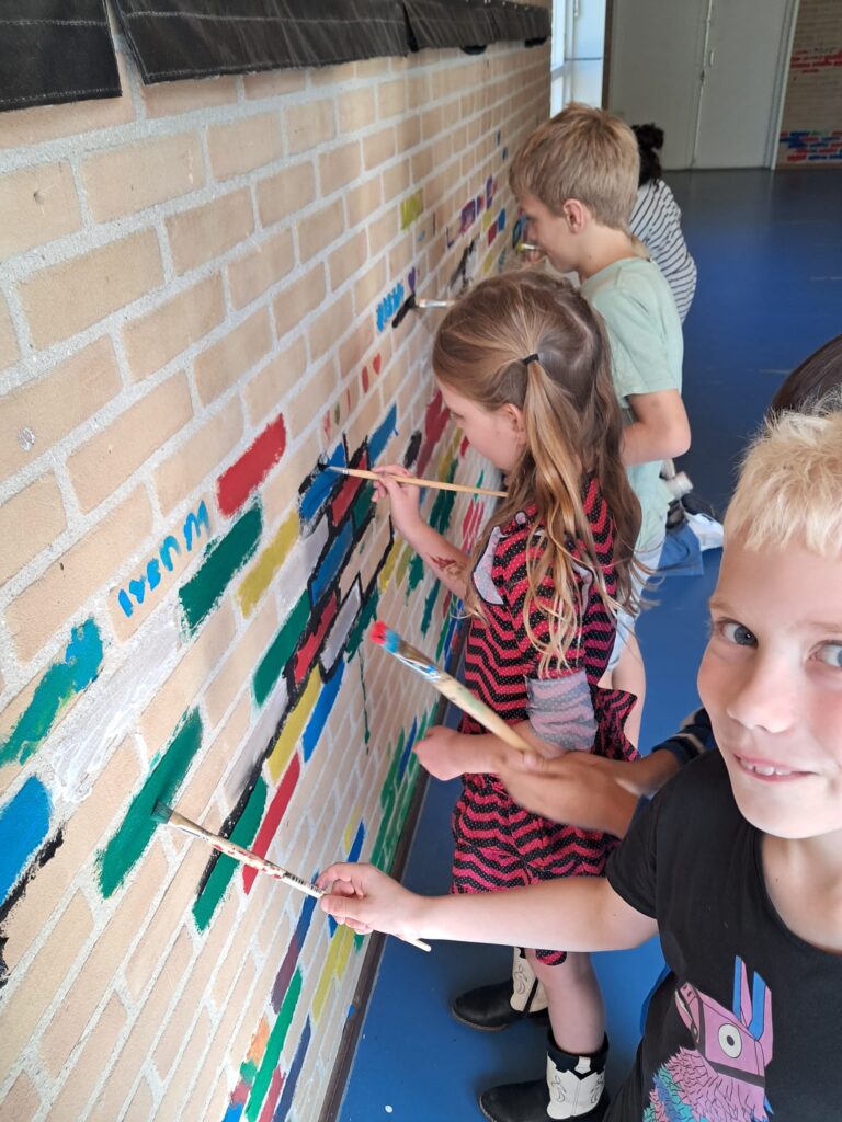 Afgelopen maandag zijn de kleuters enthousiast gestart met ons nieuwe thema Bouwen. Zij gaven de aftrap door het begin te maken aan een kleurrijke muurschildering. Later in de week hebben ook groep 3/4 en groep 5/6 hun creatieve bijdrage geleverd. Komende week is het de beurt aan groep 7/8 om hun kunsten te laten zien. Zo bouwen alle groepen letterlijk en figuurlijk samen aan één groot kunstwerk!