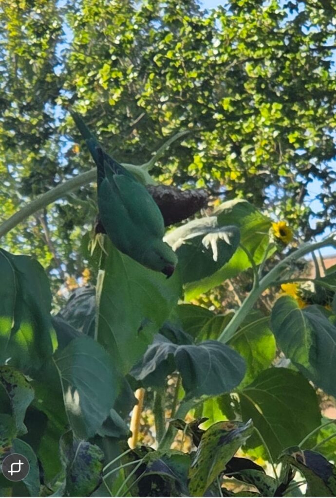 De leerlingen zijn nog druk bezig in de schooltuin. De zonnebloemen groeien meters hoog. Van de week zat er een halsbandparkiet heerlijk de zaadjes van de zonnebloemen op te peuzelen.