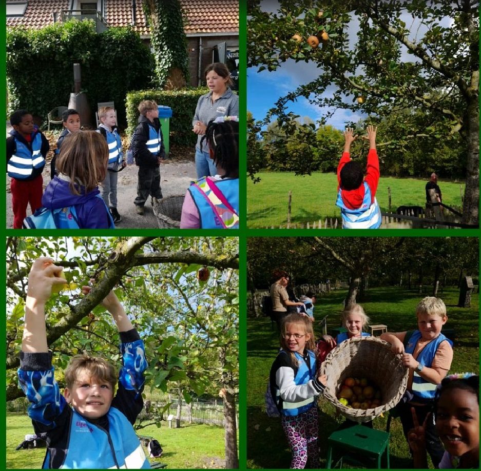 Ze begonnen in de boomgaard. De bomen die daar staan zijn ongeveer 20 jaar oud. Alle kinderen mochten een appel of een peer plukken. Gelukkig stonden er krukjes want de mooiste hingen hoog in de boom. Met een volle mand gingen ze naar de grote zaal. Daar gingen de kinderen in groepjes appelmoes en appelsap maken. Het moest in hele kleine stukjes gesneden worden, een precies werkje. De appels werden in de pan gedaan voor de appelmoes en in een speciale machine voor de appelsap. Na een uurtje konden we de appelsap proeven. Dat smaakte lekker. De appelmoes hebben de kinderen mee naar huis gekregen. Misschien heeft u ook mogen proeven. Het was weer een leerzaam uitje!