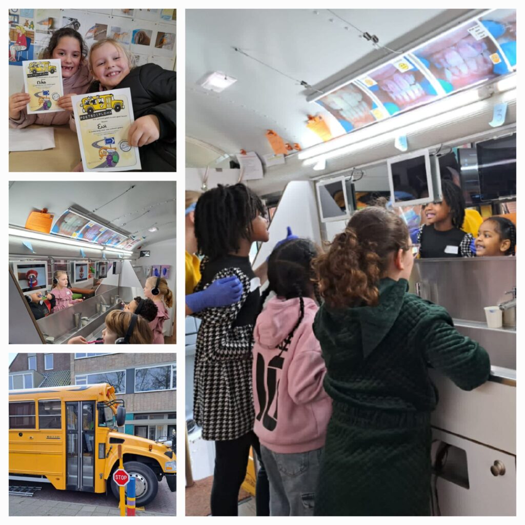 Afgelopen week kwam de poetsbus langs. Eerst gingen de leerlingen kijken waar de plakbeestjes op je tanden zitten. Met een speciaal ‘pilletje’ werden je tanden paars waar je beter moest poetsen. Daarna werd er goed gepoetst om ze allemaal weg te krijgen. En stapten de kinderen met een poetsdiploma de bus weer uit.