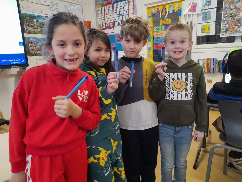 We schrijven eerst altijd met potlood om de letters goed en netjes te leren schrijven. De kinderen kunnen dat nu zo netjes dat ze vanaf nu met een pen gaan oefenen. Wat zijn ze trots!