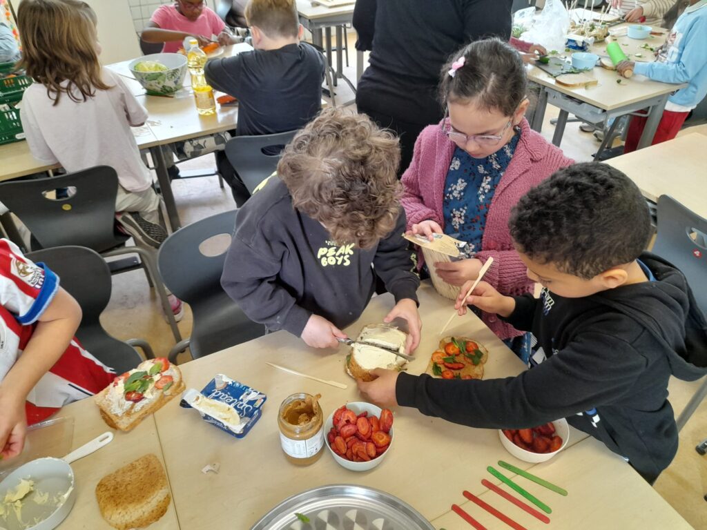 In groep 3/4 hebben de kinderen in groepjes gezonde gerechtjes voor de lunch gemaakt. Samen het recept lezen en de stappen volgen om tot een lekker resultaat te komen. Dat is zeker gelukt. De leerlingen hebben gesmuld van al dit lekkers en de leerkrachten ook!